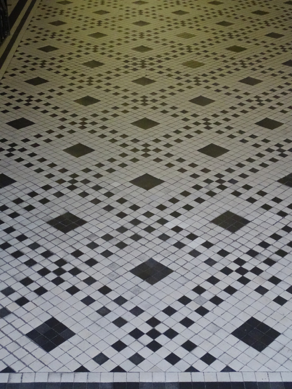 Some of the leadlight windows, both above old shop units and at the two ends of the arcade, giving indications of where the arcade leads: to Trinity Church – are the original features, and the tiled flooring looks pretty old too, even if it does not date from the 1920s, when the arcade was first built.